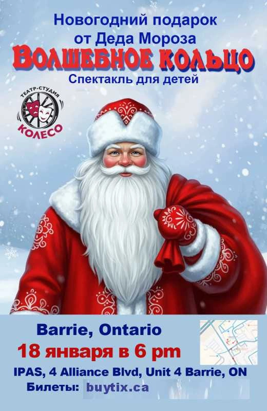 Театр-студия «КОЛЕСО» покажет спектакль «Волшебное кольцо», поставленный по одноименной сказке Б.Шергина. Дети получат подарки от Дедушки Мороза и смогут сфотографироваться с ним и с героями спектакля.