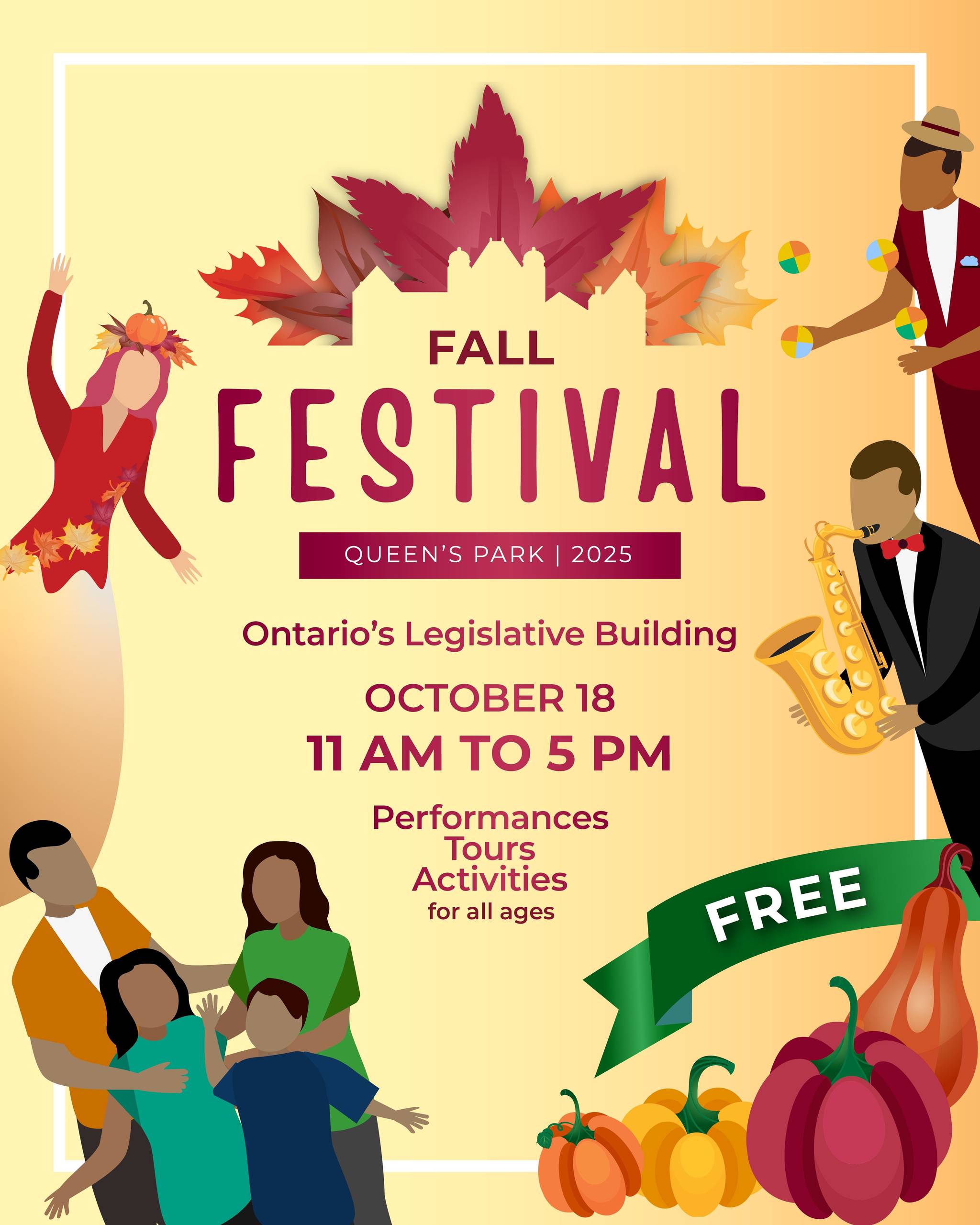 Окунитесь в уютную атмосферу, насладитесь красками осени и подарите веселье всей своей семье! Вас ждут живые выступления, цирковые номера, мастер-классы и игры для детей и взрослых. Можно пройтись по надувному кукурузному лабиринту, сделать фото у осенних фотозон и даже получить мини-тыкву в подарок после экскурсии по историческому зданию парламента. Музыка, танцы и праздничное настроение — здесь вы найдете всё, что нужно, чтобы по-настоящему почувствовать дух осени.