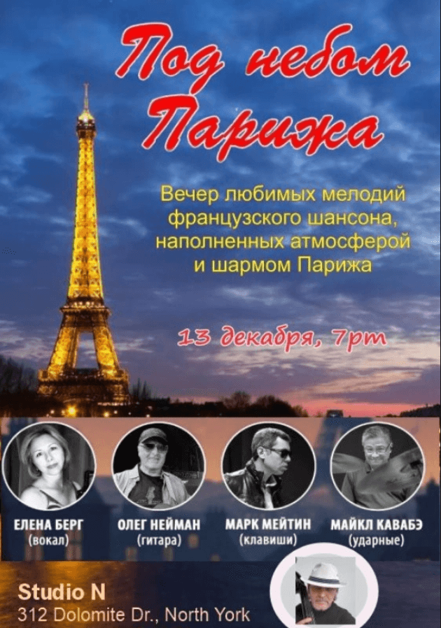 Также 13 декабря в Studio N запланирован концерт французского шансона «Под небом Парижа».