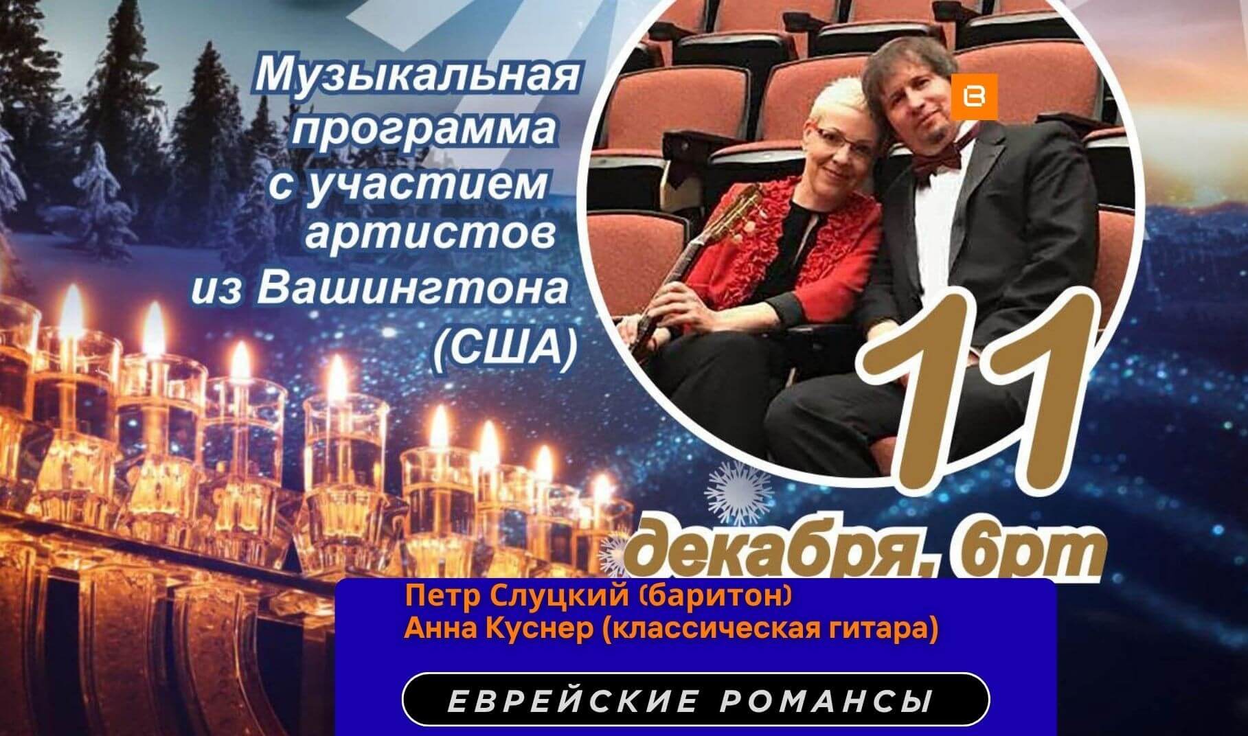 Так, например, 11 декабря в Bernard Betel Center вас ожидает музыкальная программа «Eврейский романс»с участием музыкантов из США: Пётр Слуцкий — баритон, Анна Куснер — классическая гитара.