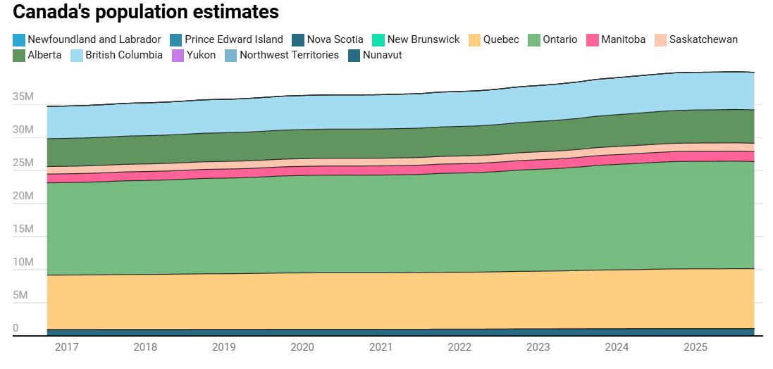 Statistics Canada в среду опубликовало предварительный отчёт за третий квартал, согласно которому численность населения страны на 1 октября составила 41,575,585 человек.