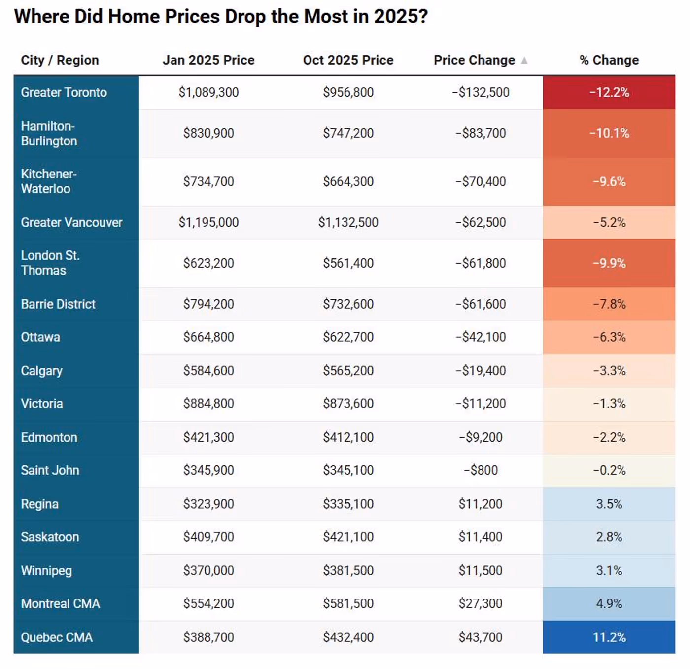 Отчёт Zoocasa сравнил, как менялись цены на жильё с января по октябрь 2025 года в 16 крупных городах Канады, включая Торонто, Гамильтон, Берлингтон, Китченер и Уотерлу. Для анализа использовались данные Canadian Real Estate Association (CREA).