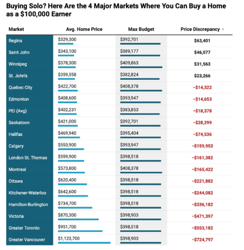 При годовом доходе в $100,000 мечта о собственном жилье наиболее достижима в Прерийных и Атлантических провинциях, при этом Реджайна стала самым доступным рынком в Канаде со средней ценой дома $329,300. В то же время в GTA одинокий покупатель сталкивается с дефицитом в $553,182 по сравнению со средней ценой жилья в регионе, которая составляет $951,700.
