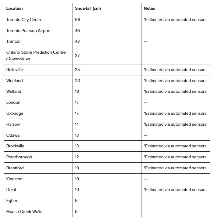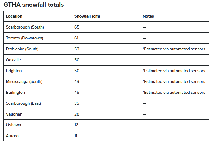 По данным Environment Canada на 10:00 утра понедельника, в отдельных районах Торонто, Миссиссаги и западной части GTA выпало от 40 см до 60 см снега. Это один из самых обильных снегопадов, когда-либо зафиксированных в регионе за одни сутки.
