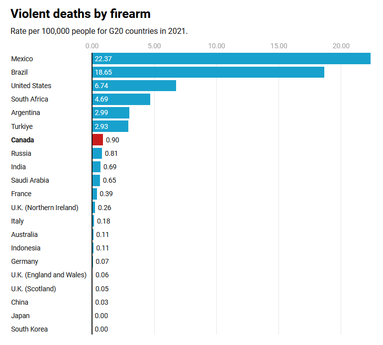 Хотя насильственные преступления с применением оружия в Канаде происходят реже, чем в США, уровень смертей от огнестрельного оружия здесь всё же выше, чем во многих других странах G20.