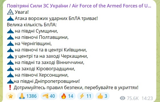 "Внимание! Атака вражеских ударных БПЛА продолжается! Большое количество БПЛА… Соблюдайте правила безопасности, находитесь в укрытиях!", – обращаются Воздушные силы к украинцам.