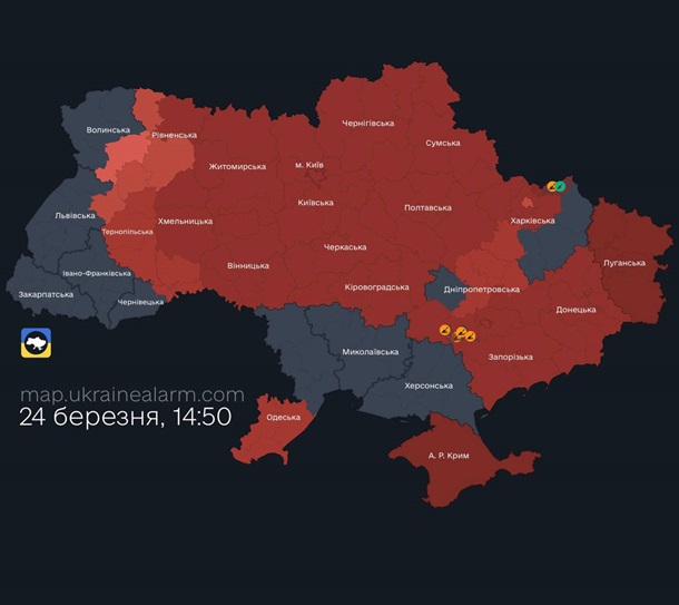 На момент публикации новости тревога постепенно распространяется на запад Украины, поэтому находитесь в укрытиях!