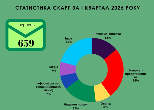 "В I квартале 2026 года на адрес уполномоченной по защите государственного языка Елены Ивановской поступило 659 жалоб граждан на нарушение закона О функционировании украинского языка как государственного. За аналогичный период 2025 года поступило 646 жалоб", - говорится в сообщении.