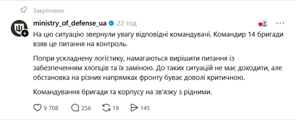"Таких ситуаций не должно происходить, но ситуация на разных фронтах может быть достаточно критичной. Командование бригады и корпуса поддерживает связь с родственниками", – говорится в сообщении Министерства обороны.