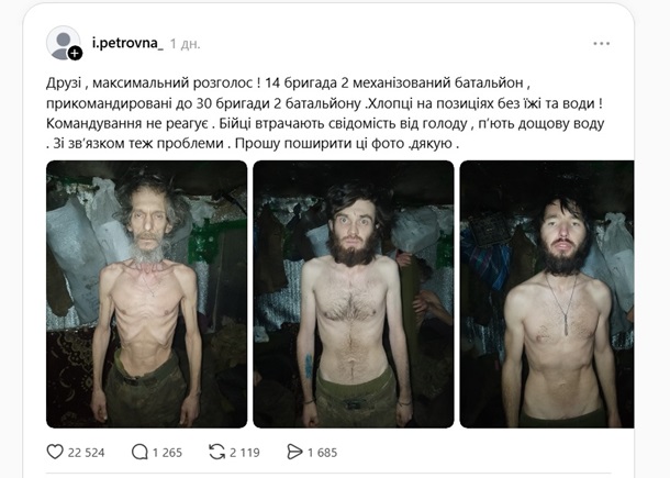 В украинском сегменте Threads разгорелся скандал из-за поста пользователя с ником i.petrovna, в котором опубликованы фото истощенных бойцов.
